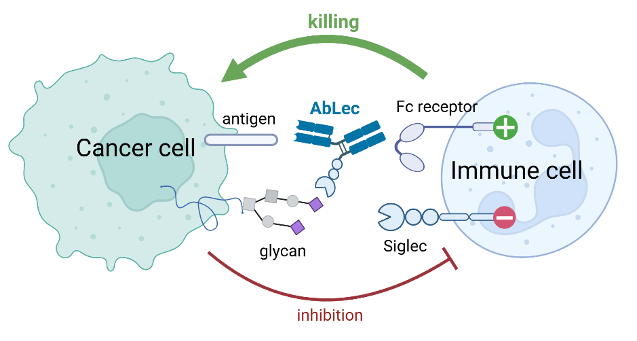 A new study, just published in Nature Biotechnology, presents a novel strategy to interfere with these sugar-based interactions. A multi-institutional research team developed antibody-lectin chimeras, called AbLec. These engineered molecules combine a conventional antibody that guides them specifically to tumor cells with a lectin domain that binds to tumor cell glycans. This structure allows AbLec to block inhibitory signals which cancer cells use to protect themselves from immune cell attack and at the same activate these immune cells via their antibody part.